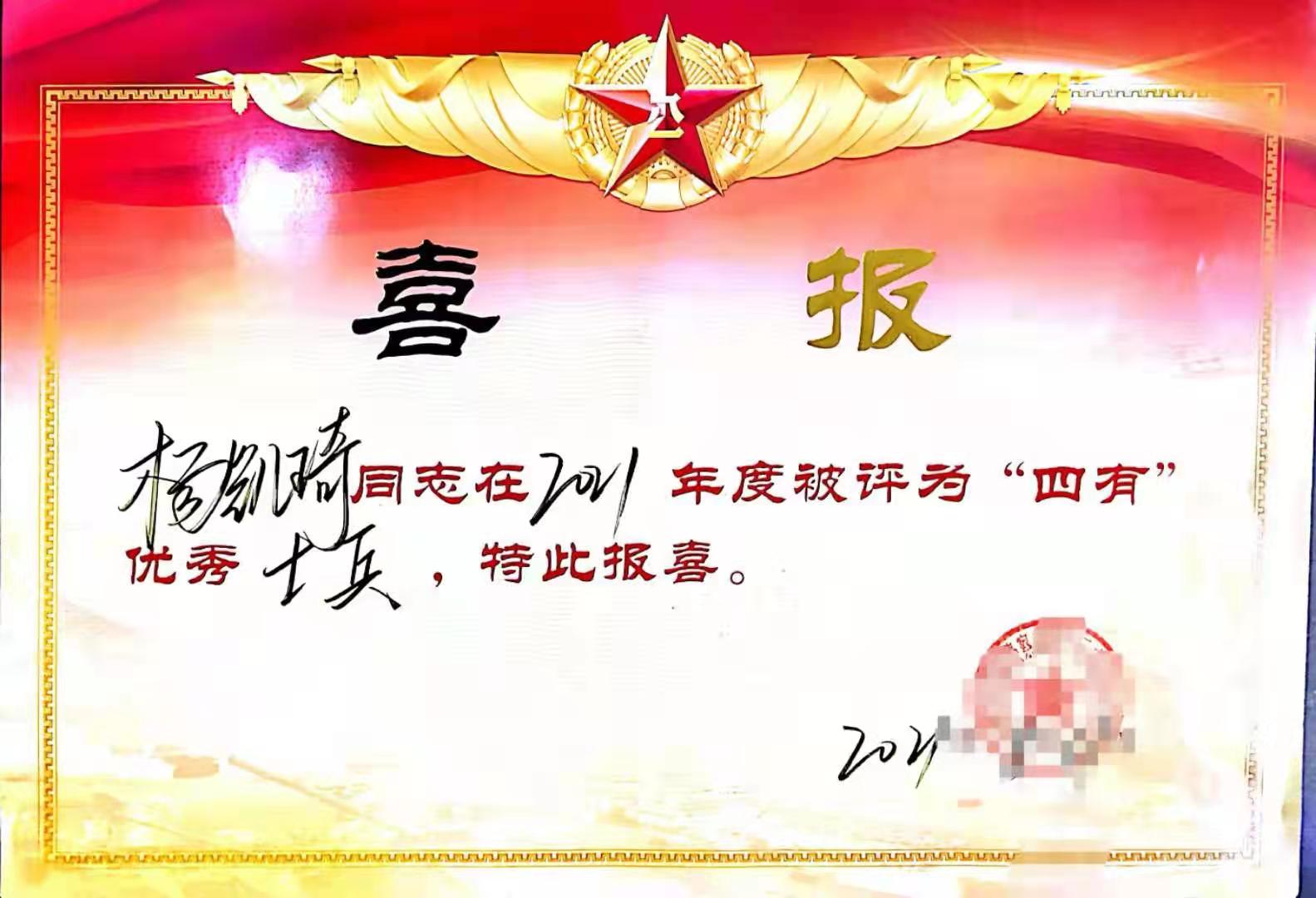 近日,我校人民武装部收到喜报,2019年参军入伍的装饰18-1班杨凯琦同志在部队表现突出,2021年度被评为“四有”优秀士兵。部队特传来喜报,共同分享杨凯琦同学的成长进步,并感谢我校为部队输送优秀兵源。