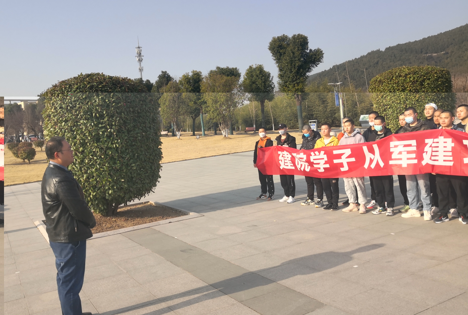 3月7日上午8点半,我校人民武装部在八一广场组织送兵会,欢送2022春季报名参军入伍的38名同学赴役前教育训练基地接受训练。临出发前,人民武装部李珂副部长发表了动员讲话,他对大家提出“三祝”,一是祝贺同学们经过层层选拔后,能够进入役前训练阶段;二祝福大家坚持完成役前教育训练各项考核,接受祖国挑选;三祝愿大家在军营事事顺利,安心扎根军营,展现建院学子风采!